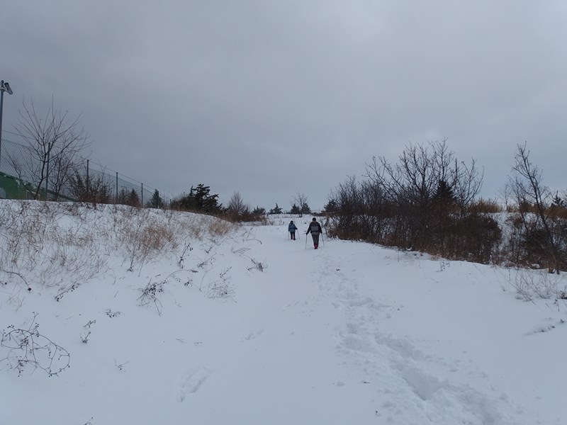 Sul sentiero con neve vergine a lato dell'impianto fotovoltaico