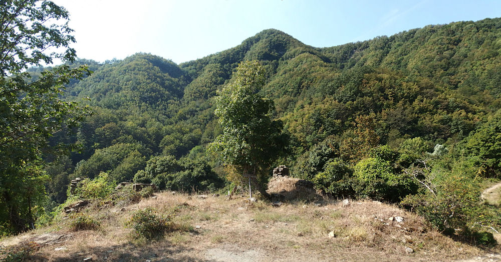 I pochi ruderi rimasti di Ciriegiolone sullo sfondo di Poggio delle Serra