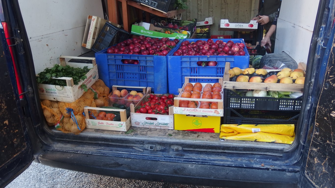 Il venditore ambulante di frutta e verdura con la sua merce a Campaccio