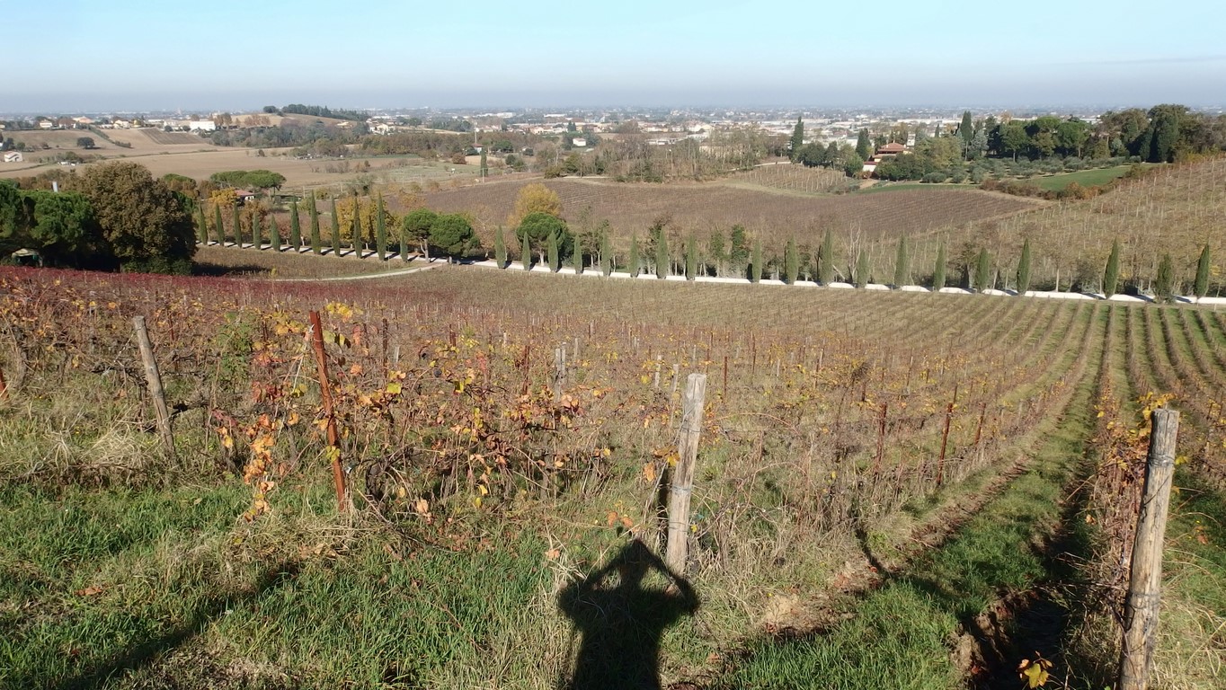 Filare di cipressi a lato della Via Colombarone visto dal vigneto della Fattoria Paradiso