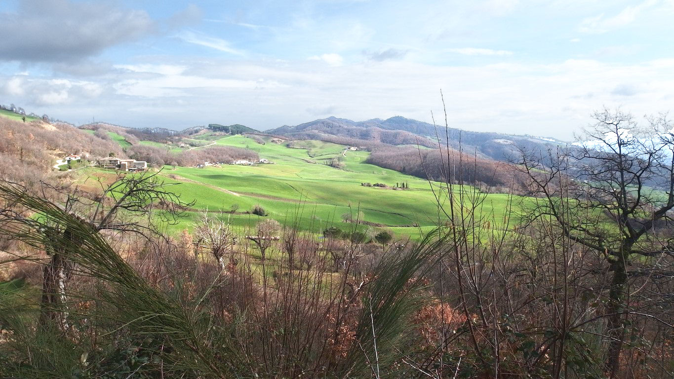 Campi coltivati illuminati dal sole sotto Ca di Braccio e Podere Fossa
