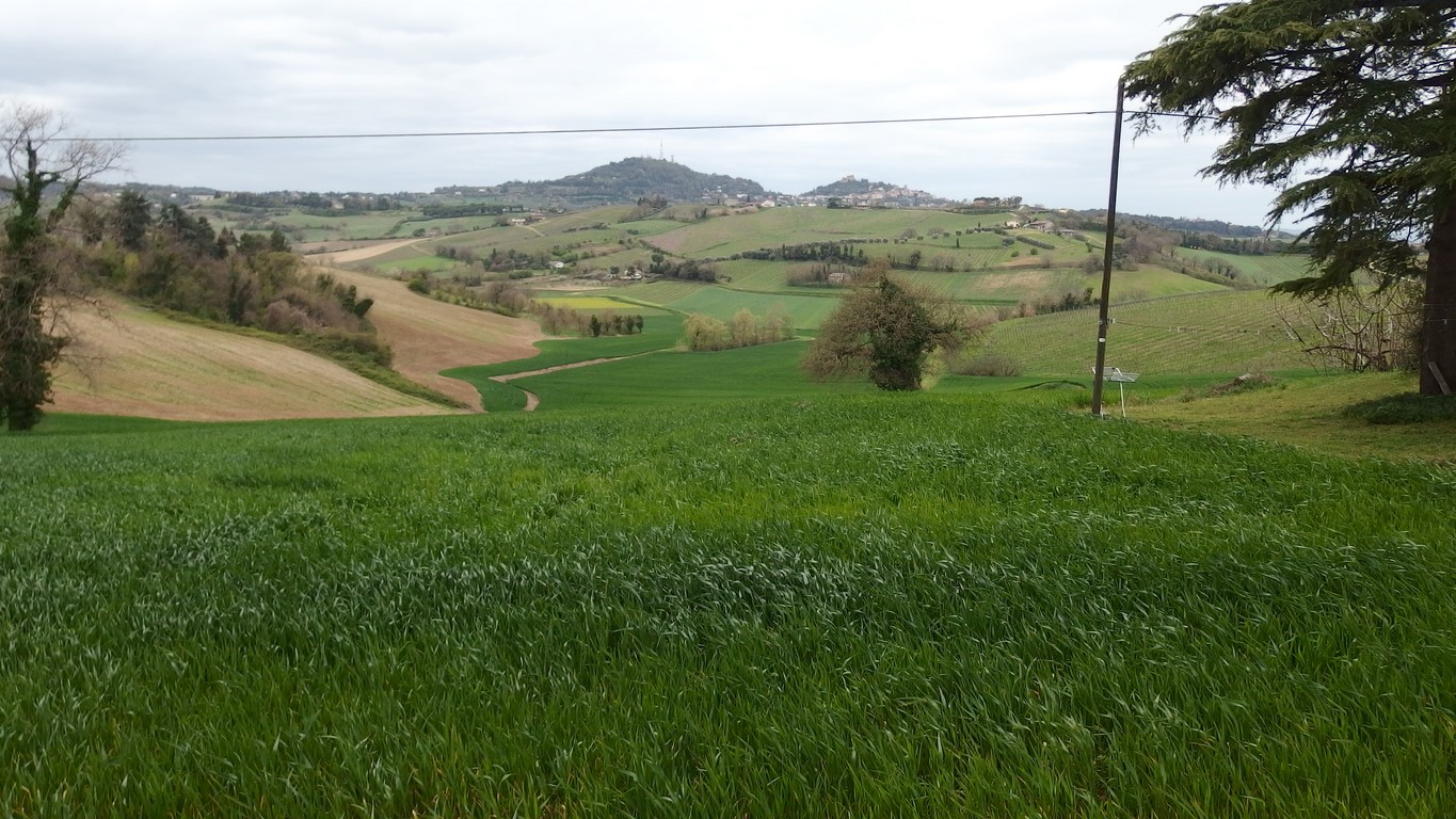La valle dello Scolo Vedreto dalla Via Vicinale Monticino; sullo sfondo Monte Maggio e Bertinoro